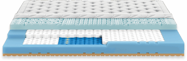 BI-PORE è un materasso innovativo, composto da un doppio strato in AQUAPORE GEL, con l’aggiunta di MINDFOAM e GRAVITYFOAM, per offrire comfort ottimale anche su