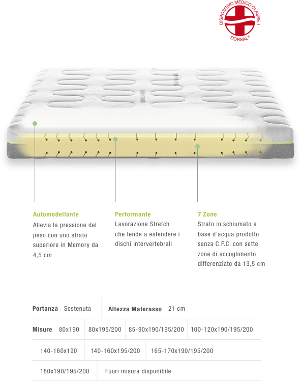 Lastra modellata a sette zone di accoglimento differenziato, con lavorazione stretch e strato superiore in visco elastico automodellante e termosensibile.