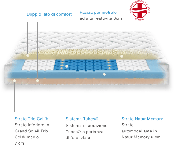 L’elasticità e indeformabilità degli elementi Tubes® sviluppano una perfetta contropressione. Studiati con diversi gradi di rigidità, sono puro comfort ergonomico a 7 zone.
